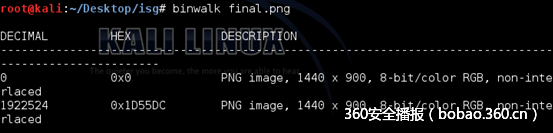 利用binwalk可以自动化的分析图片中附加的其他的文件,其原理就是检索匹配文件头,常用的一些文件头都可以被发现,然后利用偏移可以配合winhex或者是dd分割出隐藏的部分。