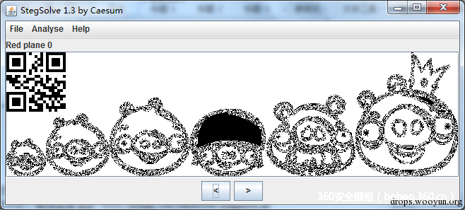 打开之后,使用Stegsolve——Analyse——Frame Browser这个可以浏览三个颜色通道中的每一位,可以在红色通道的最低位,发现一个二维码,然后可以扫描得到结果。