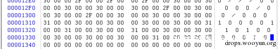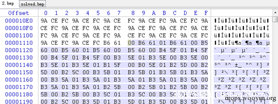 有不是00的字节,一开始还以为这些就是flag的信息了,后来才发现是因为两个图片sub影响到了效果,真正的信息是隐藏在2.png中的,所以 打开由2.png转换的2.bmp来对,通过之前diff得到的偏移,寻找到0x1110的地方,直到0x1330结束,这是隐藏的信息。
