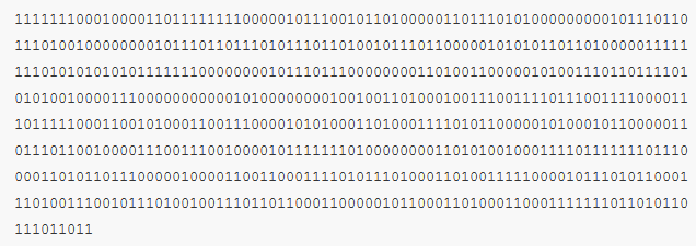 str = "1111111000100001101111111100000101110010110100000110111010100000000010111011011101001000000001011101101110101110110100101110110000010101011011010000011111111010101010101111111000000001011101110000000011010011000001010011101101111010101001000011100000000000101000000001001001101000100111001111011100111100001110111110001100101000110011100001010100011010001111010110000010100010110000011011101100100001110011100100001011111110100000000110101001000111101111111011100001101011011100000100001100110001111010111010001101001111100001011101011000111010011100101110100100111011011000110000010110001101000110001111111011010110111011011"