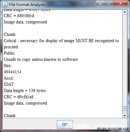 这个题需要我们对于png图片的格式有一些了解,先用stegsolve查看一下,其他的LSB之类的并没有发现什么问题,然后看了一下结构发现,有一些异常的IDAT块。IDAT是png图片中储存图像像数数据的块。Png图片格式的扩展阅读可以看看这篇