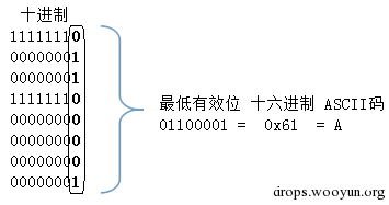 一种常见的方式是利用LSB来进行隐写,LSB也就是最低有效位 (Least Significant Bit)。原理就是图片中的像数一般是由三种颜色组成,即三原色,由这三种原色可以组成其他各种颜色,例如在PNG图片的储存中,每个颜色会有 8bit,LSB隐写就是修改了像数中的最低的1bit,在人眼看来是看不出来区别的,也把信息隐藏起来了。譬如我们想把’A’隐藏进来的话,如下图,就 可以把A转成16进制的0x61再转成二进制的01100001,再修改为红色通道的最低位为这些二进制串。