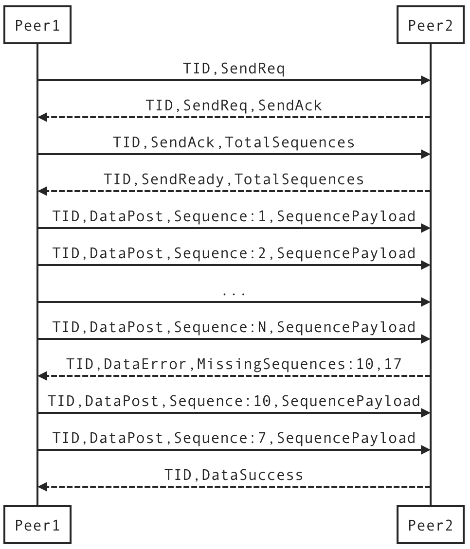 TIDis transaction IDSendReq, SendAck, SendRead, DataPost, DataError, DataSuccessare packet typesTotalSequencesis total packets of the data that will be sentSequenceis the sequence number of payload as a subset of the dataSequencePayloadis the payload a particular packetMissingSequencesis a list of sequences that have not received