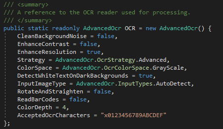 AdvancedOcrobject where itsAcceptedOcrCharactersfield has been explicitly defined.As observable at the bottom of this image, I have defined