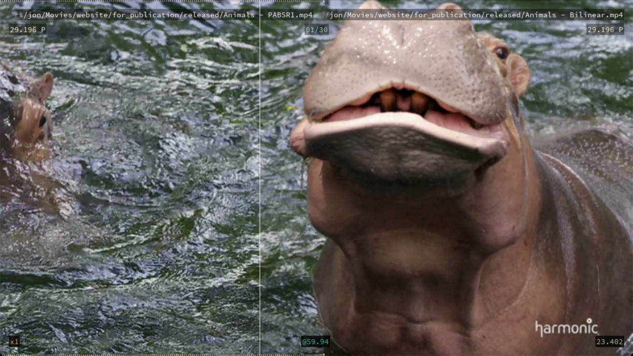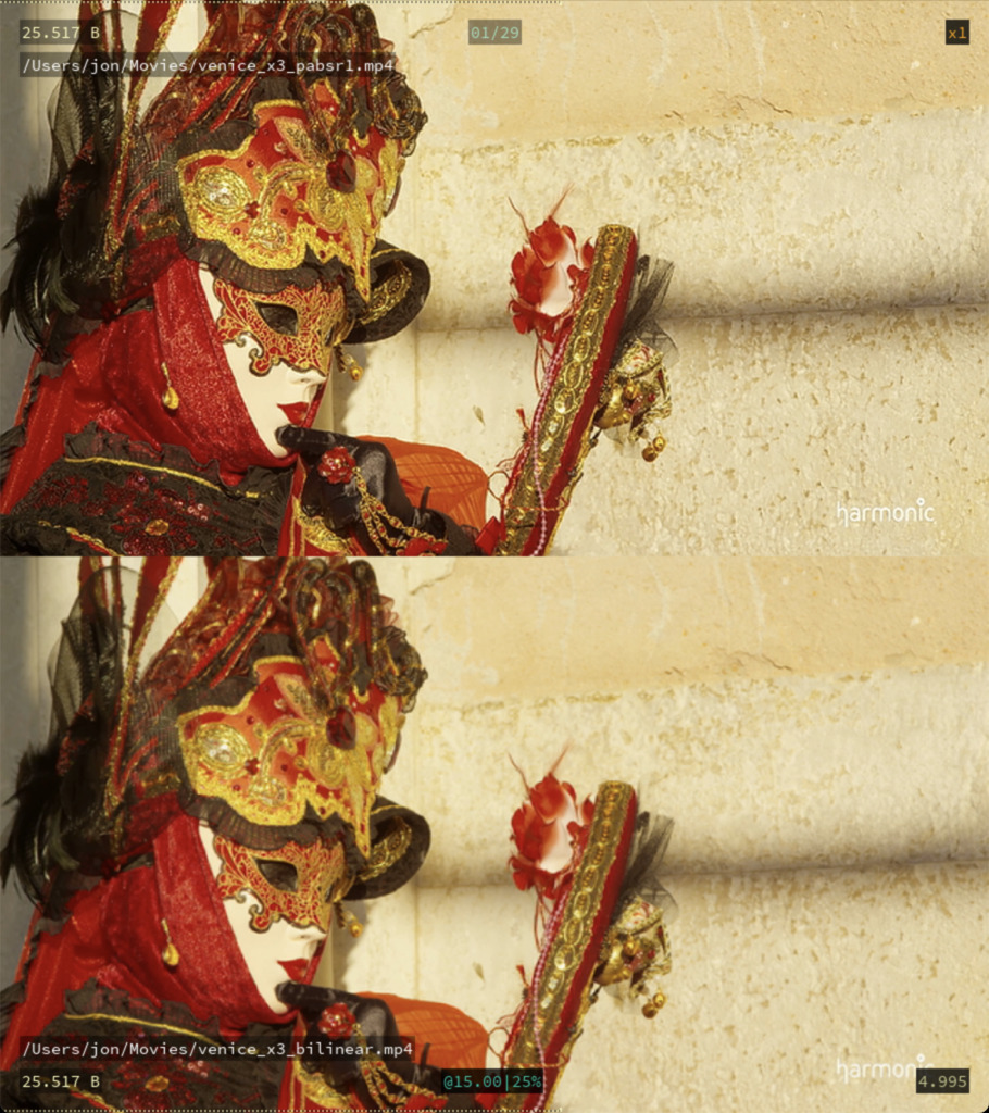 Compare a reference (left) video against multiple renditions (right) by specifying more than two input paths. Useful for comparing a reference encode to multiple renditions (e.g. different bitrates or encoder settings), or for comparing ground truth, input, and model output in one session. Command-line settings are shared for all right videos, and the active right video can be switched within the UI: