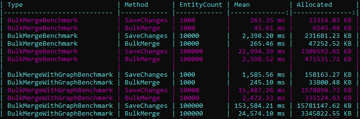 Entity Framework Extensions is much faster than EF Core, with memory usage gains that depend on the dataset size.