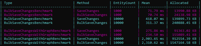 Entity Framework Extensions is consistently faster than EF Core, however currently use more memory.